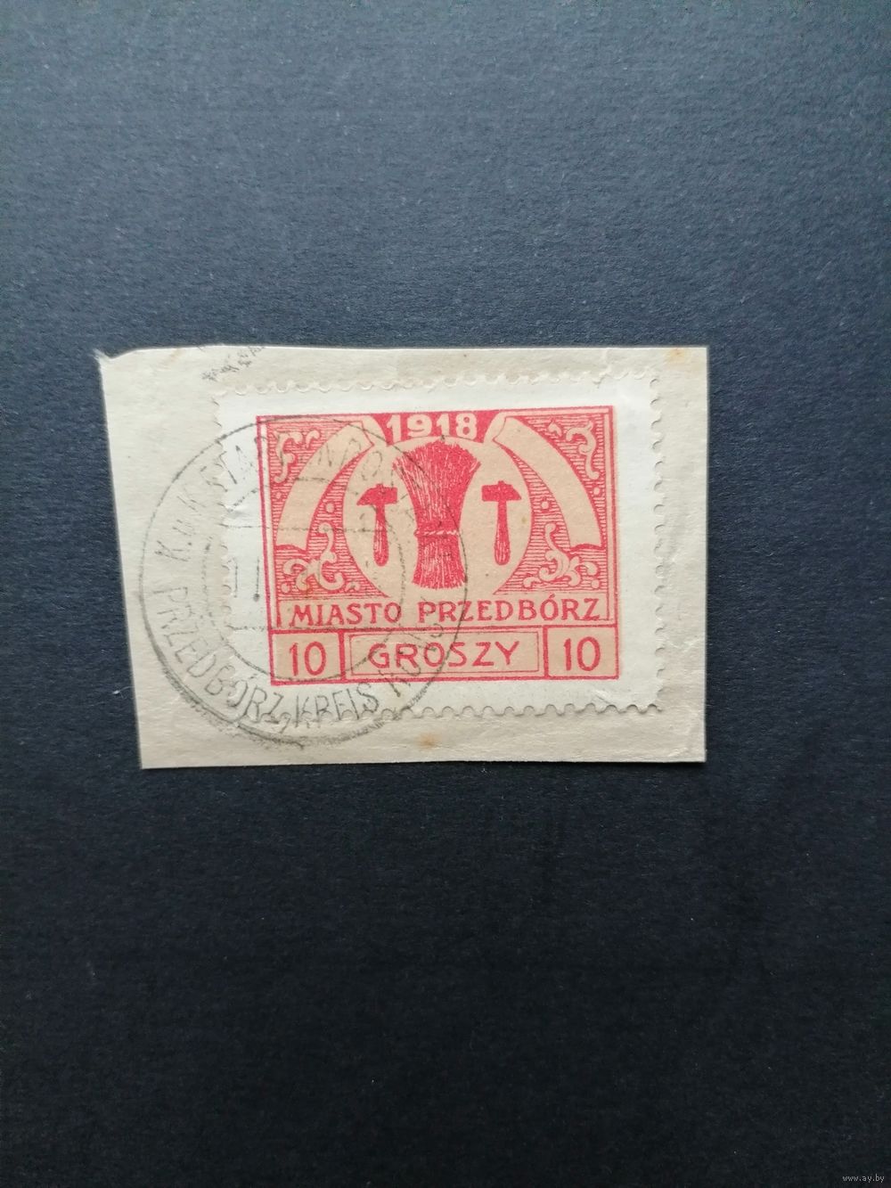 Польша 1918 Марка на вырезке из серии "Przedborz" выпуск 26.02.1918 перфорация 11 1/2 "Виды и гербы города" (гашение) Mi.6В каталог 60.00 евро