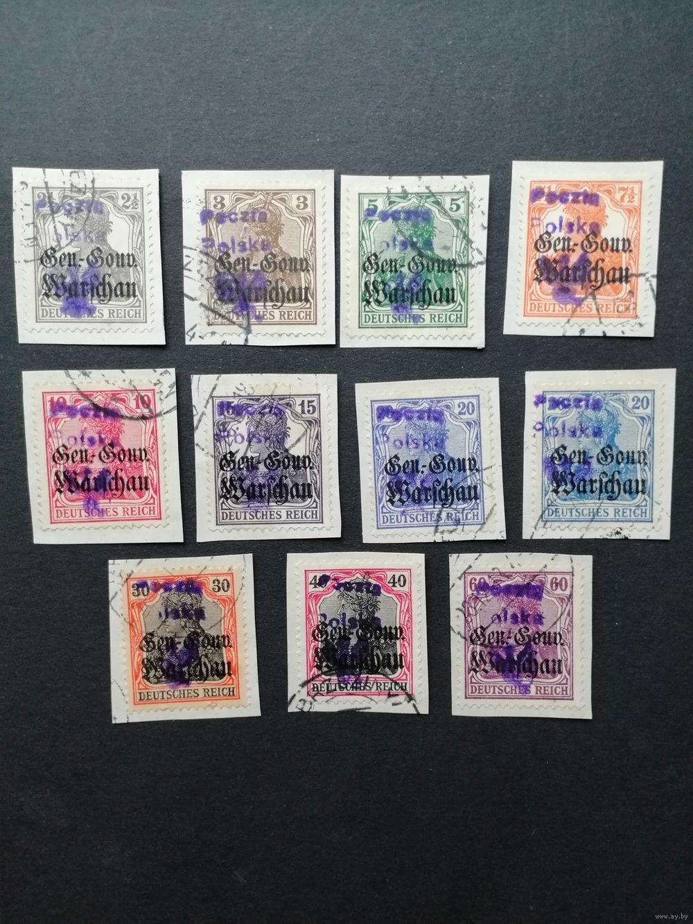 Польша 1918 Марки с надпечаткой "Poczta Polska Brzeziny" на вырезках с марками Германии 1914/1918 годов выпуска оккупационной дирекции в Варшаве Mi.6-10,12-16 (гашение BRZEZINY) каталог 20.00 евро