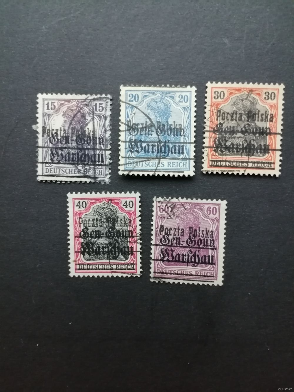 Польша 1918 Неполная серия марок с надпечаткой "Poczta Polska" на марках Германии выпуска 1914/1918 года (гашеные с наклейками) Mi.9-13 тип I (Mi.10 С) каталог 2.00 евро