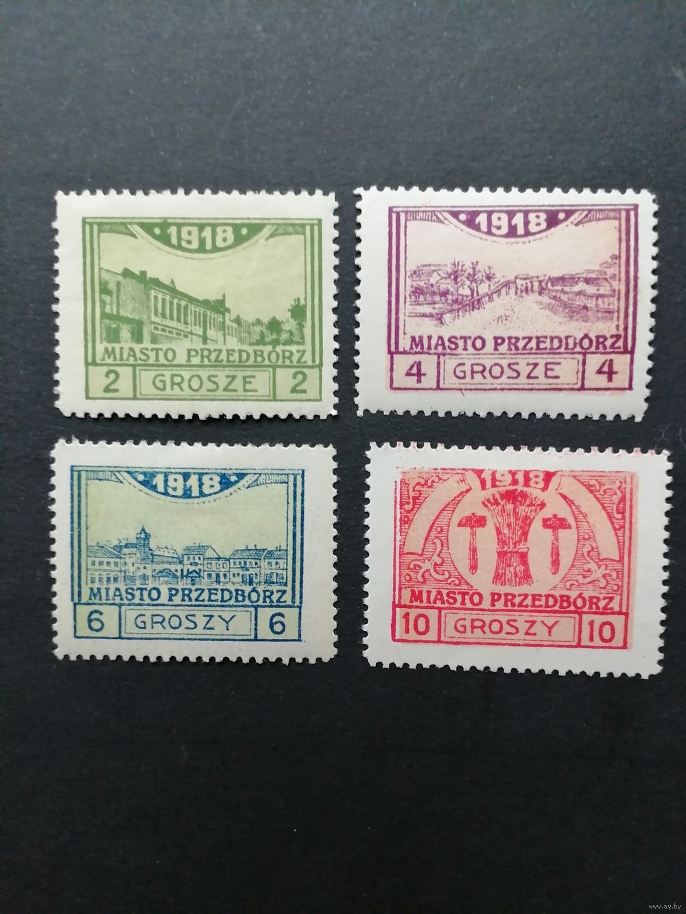 Польша 1918 Полная серия марок "Przedborz" выпуск 26.02.1918 перфорация 11 1/2 "Виды и гербы города" (чистые* с наклейками) Mi.3В-6В каталог 132.00 евро