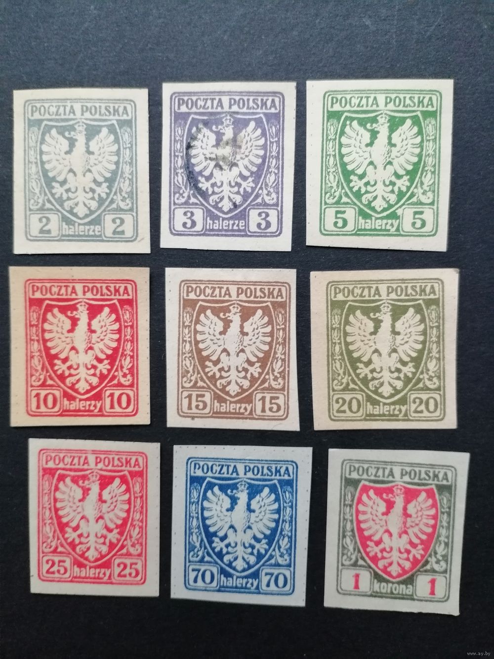 Польша 1919 Неполная серия марок без перфорации "GALIZIEN" выпуска "Гербовый щит" (чистые* есть наклейки) Mi.54-56,58-61,63-64 каталог 4.80 евро