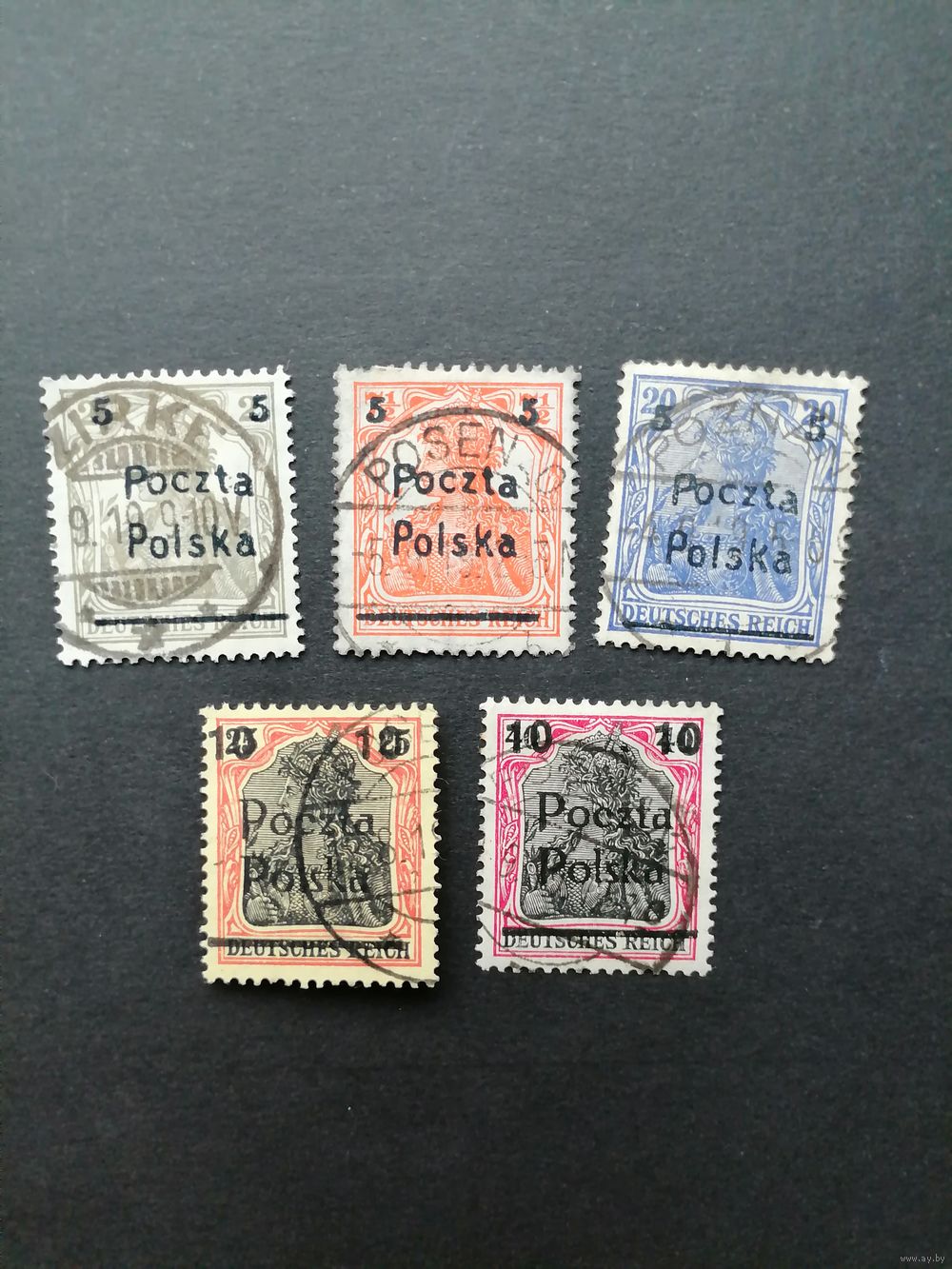 Польша 1919 Полная серия марок с надпечаткой "Poczta Polska" дирекции в Познани на марках Германии Mi.87-88,90,99,102 (гашение) Mi.130-134 каталог 35.00 евро