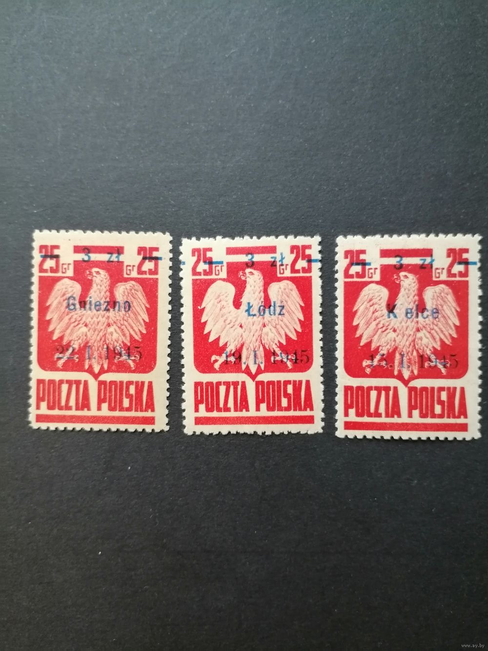 Польша 1945 Неполная серия марок с надпечаткой нового номинала и датой освобождения городов Польши на марке Mi.383 1944 года "Национальные символы" (чистые**) Mi.390III,390V,390VII каталог 25.50 евро