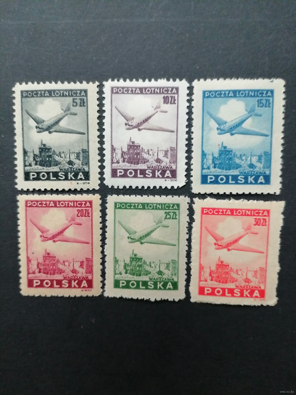 Польша 1946 Полная серия марок "Авиапочта: самолет над Варшавой" (чистая*, есть наклейки) Mi.428-433 каталог 17.00 евро