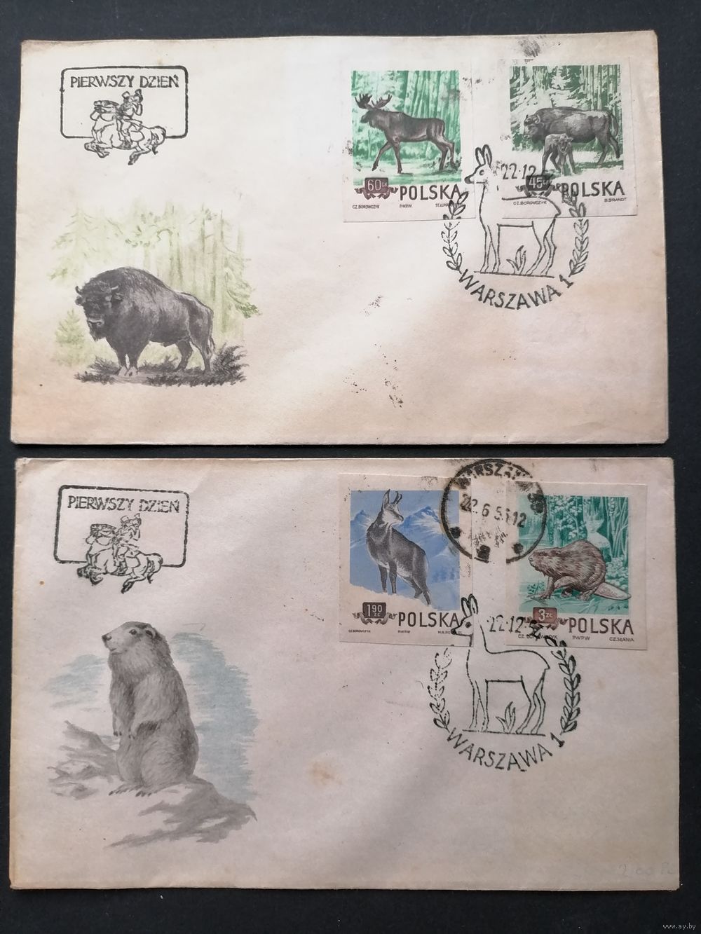 Польша 1954 Два КПД с полной серией марок "Охраняемые лесные и горные животные" (спецгашение) марки Mi.885В-888В каталог 10.00 евро