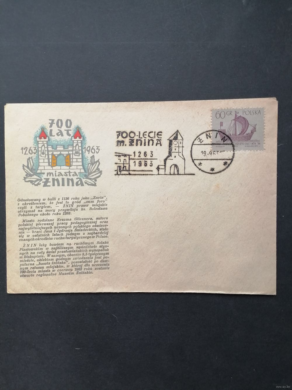 Польша 1963 КПД посвященный 700-летию города Жнин с маркой из серии "Парусные суда" (спецгашение) Mi.1388