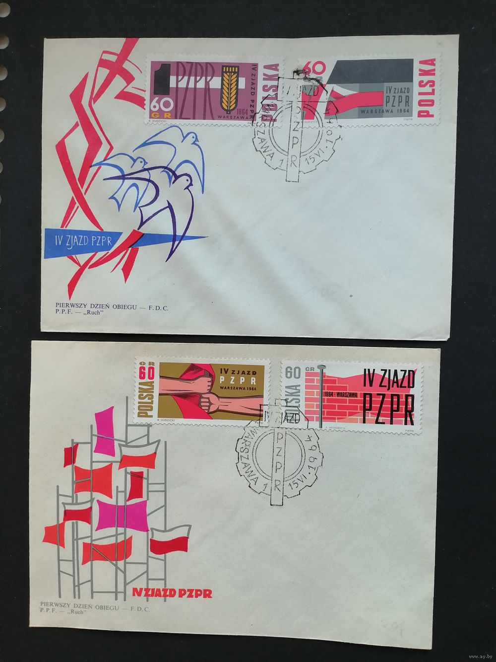 Польша 1964 Два КПД с полной серией марок "IV конгресс Польской объединенной рабочей партии" (спецгашение) Mi.1499-1502 каталог 1.00 евро