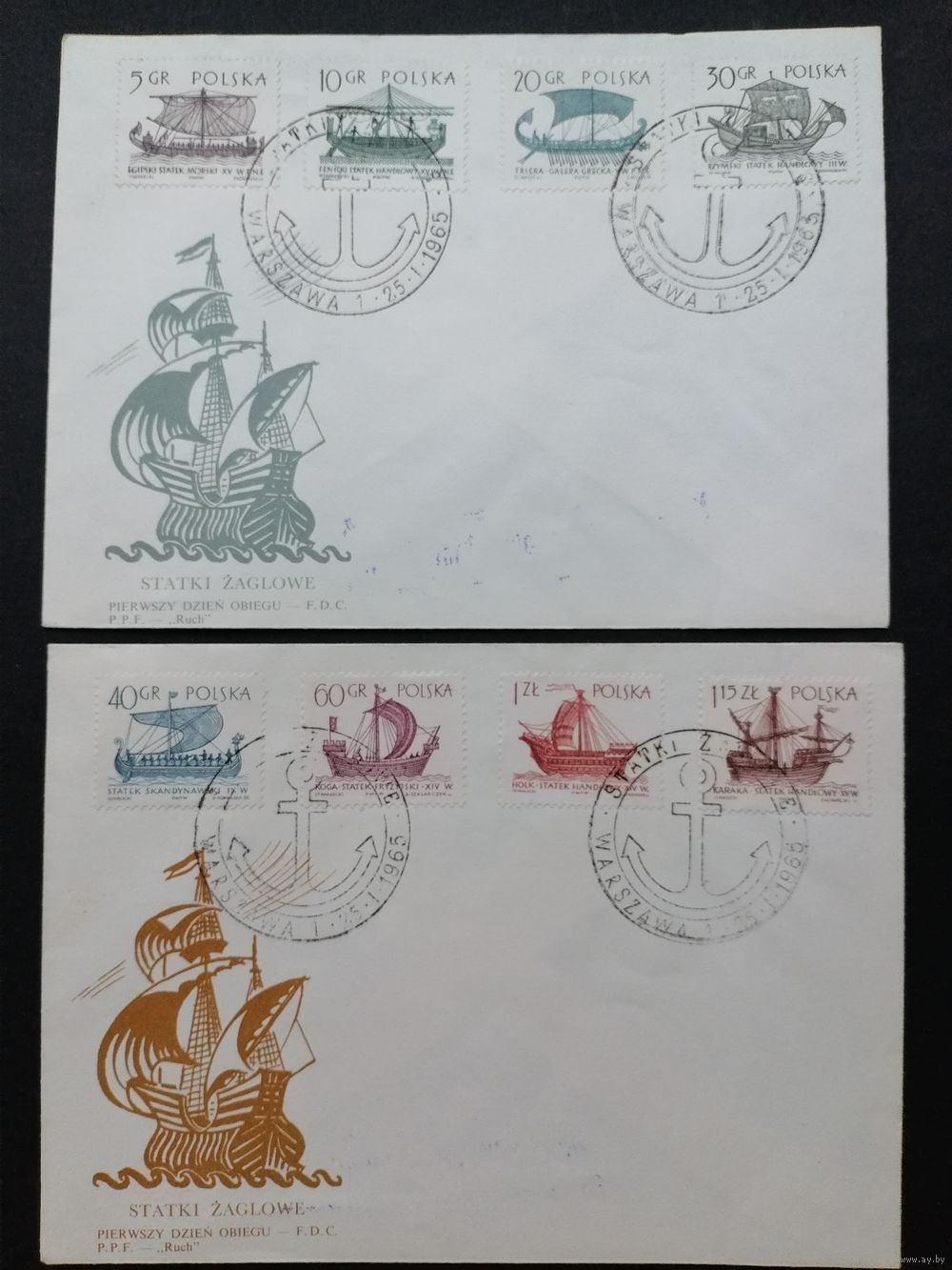 Польша 1965 Два КПД с полной серией марок "Парусники" (спецгашение) Mi.1562-1569 каталог 1.20 евро