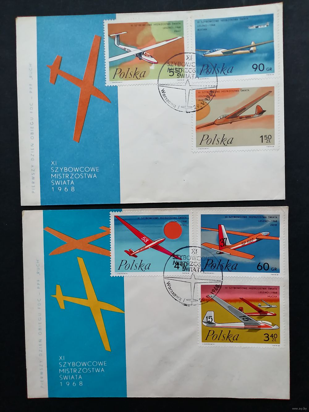 Польша 1968 Два КПД с полной серией марок "XI чемпионат мира по планерному спорту в городе Lissa (Leszno)" (спецгашение) Mi.1846-1851 каталог 4.50 евро