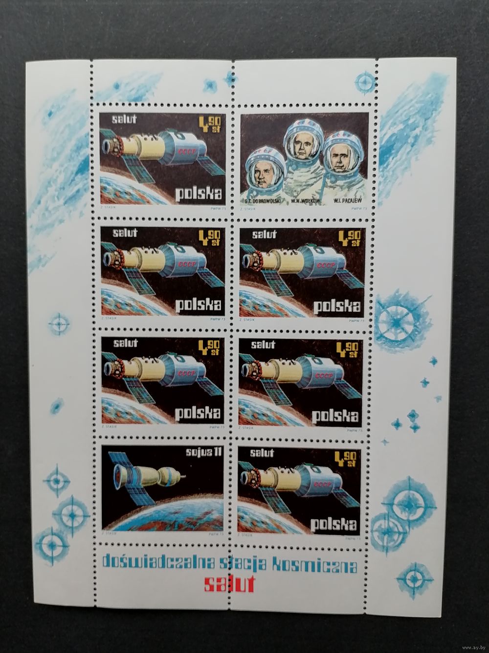 Польша 1973 Блок Mi.53 с 6 марками и 2 купонами "Космические исследования: советская опытная станция "Салют"" (чистый**) марка Mi.2255 каталог 12.00 евро
