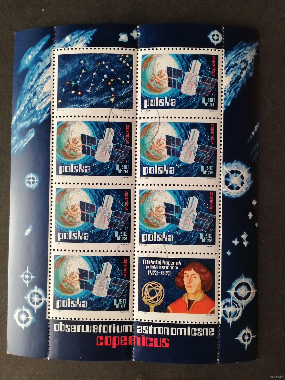 Польша 1973 Блок Mi.54 с 6 марками и 2 купонами "Космические исследования: американская опытная станция "COPERNICUS"" (гашение с клеем) марка Mi.2256 каталог 5.00 евро