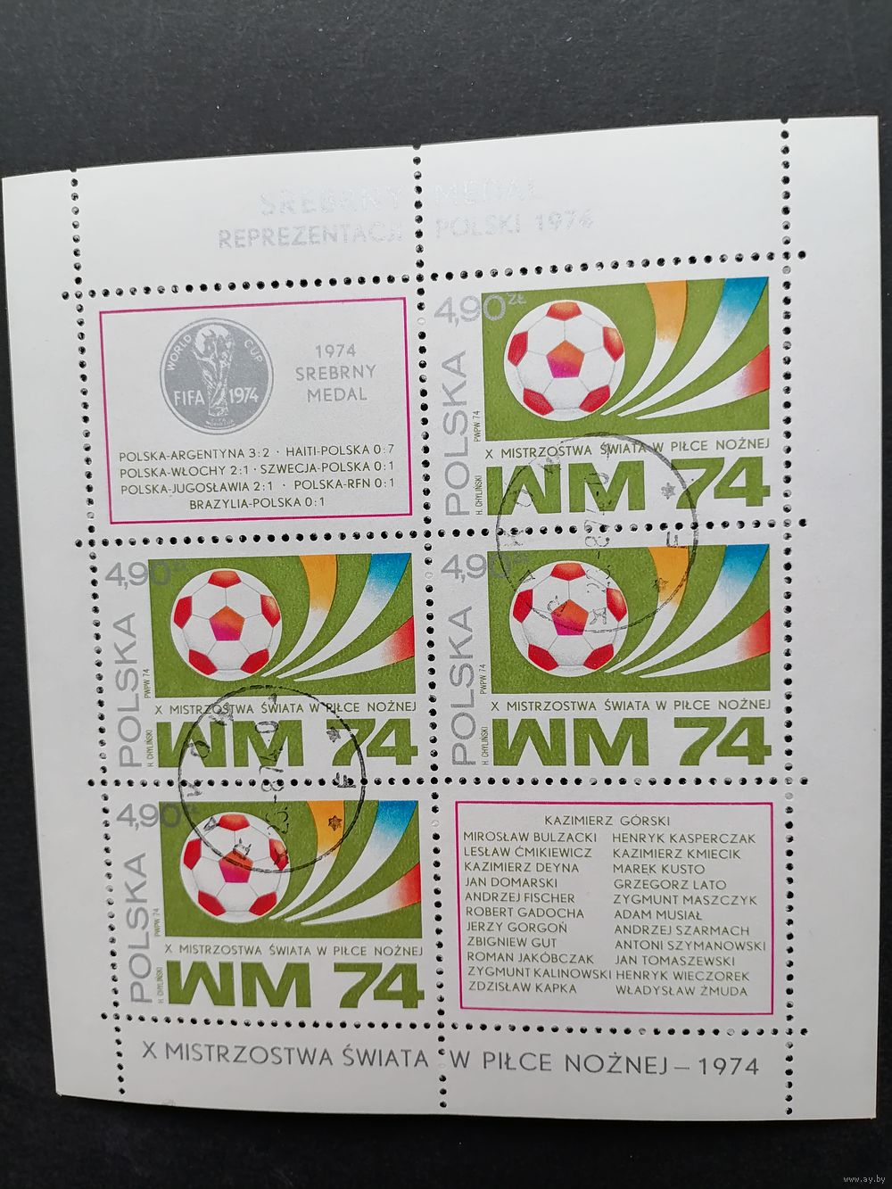 Польша 1974 Блок Mi.60 с 4 марками и 2 купонами серии "Чемпионат мира по футболу в Германии" (гашение с клеем без наклеек) марки Mi.2328 каталог 2.50 евро