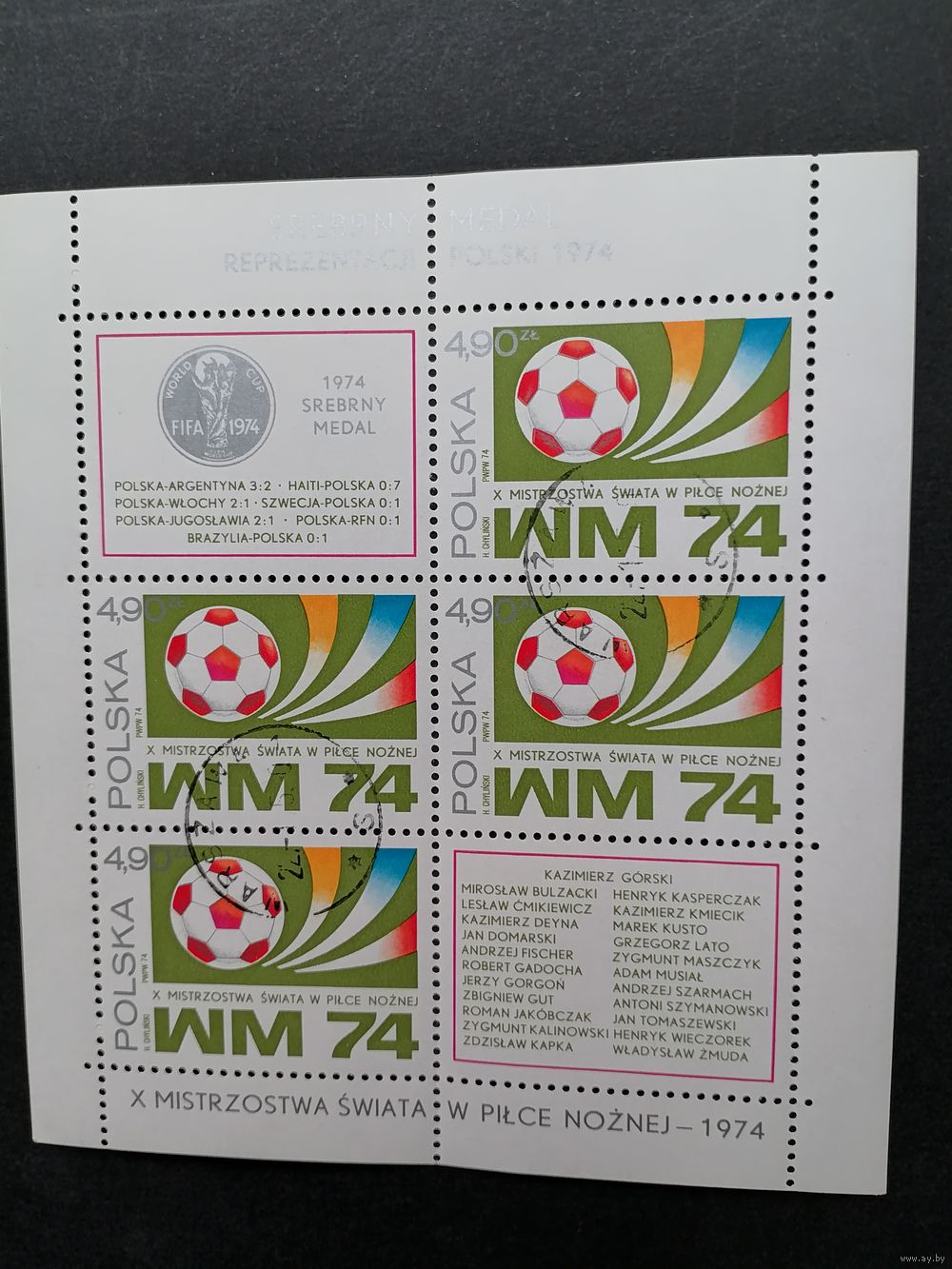 Польша 1974 Блок Mi.60 с 4 марками и 2 купонами серии "Чемпионат мира по футболу в Германии" (гашение с клеем без наклеек) марки Mi.2328 каталог 2.50 евро