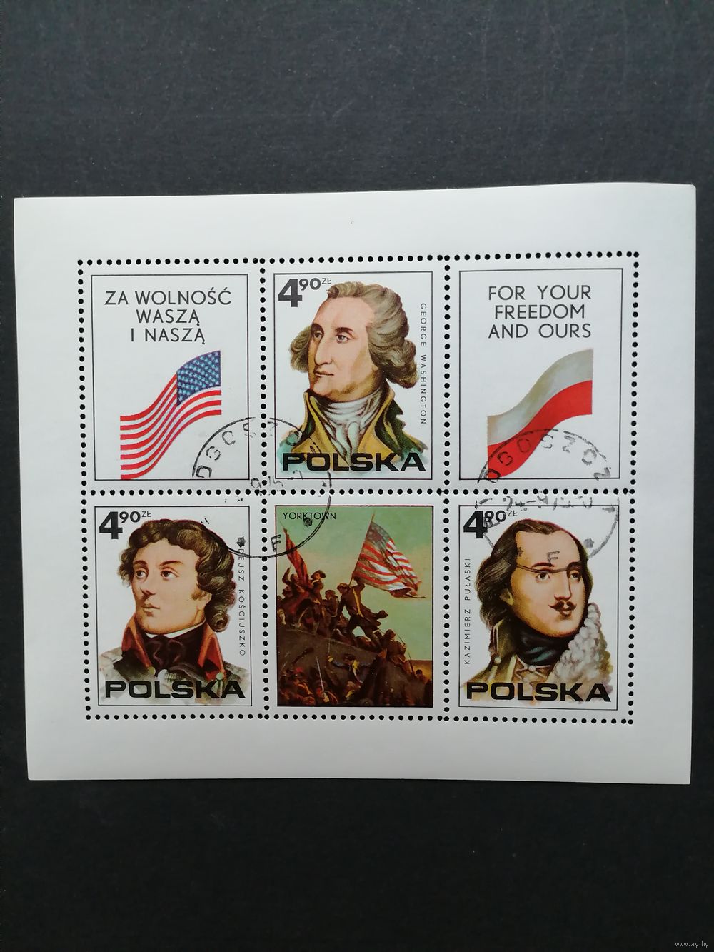 Польша 1975 Блок Mi.63 с 3 марками и 3 купонами "200 лет Независимости Соединенных Штатов Америки" (гашение с клеем) марки Mi.2405-2407 каталог 1.50 евро