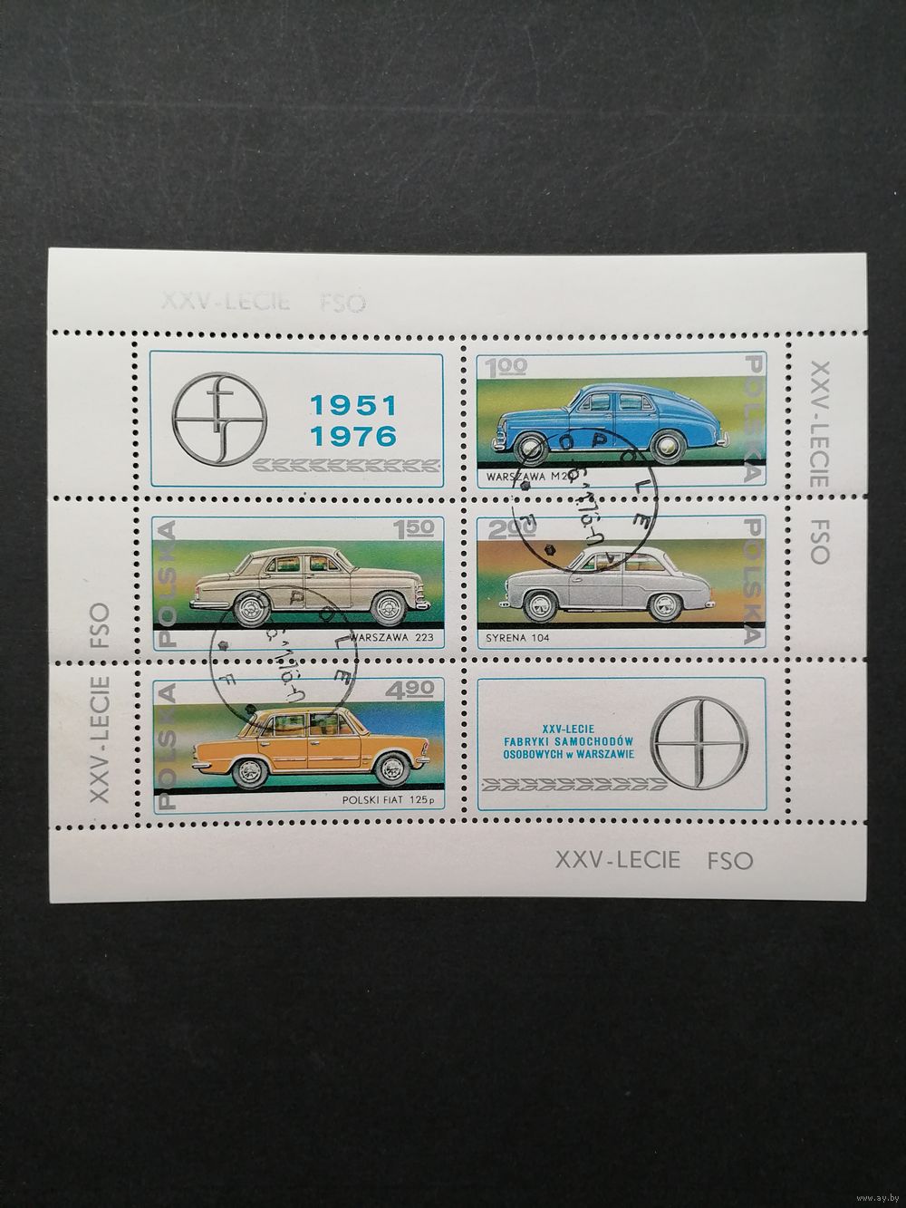 Польша 1976 Блок Mi.66 с 4 марками и 2 купонами "25 лет автозаводу FSO в Варшаве" (гашение с клеем) марки Mi.2467-2470 каталог 2.00 евро