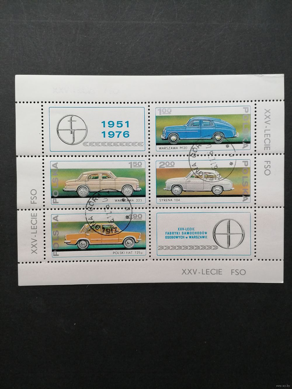 Польша 1976 Блок Mi.66 с 4 марками и 2 купонами "25 лет автозаводу FSO в Варшаве" (гашение с клеем) марки Mi.2467-2470 каталог 2.00 евро
