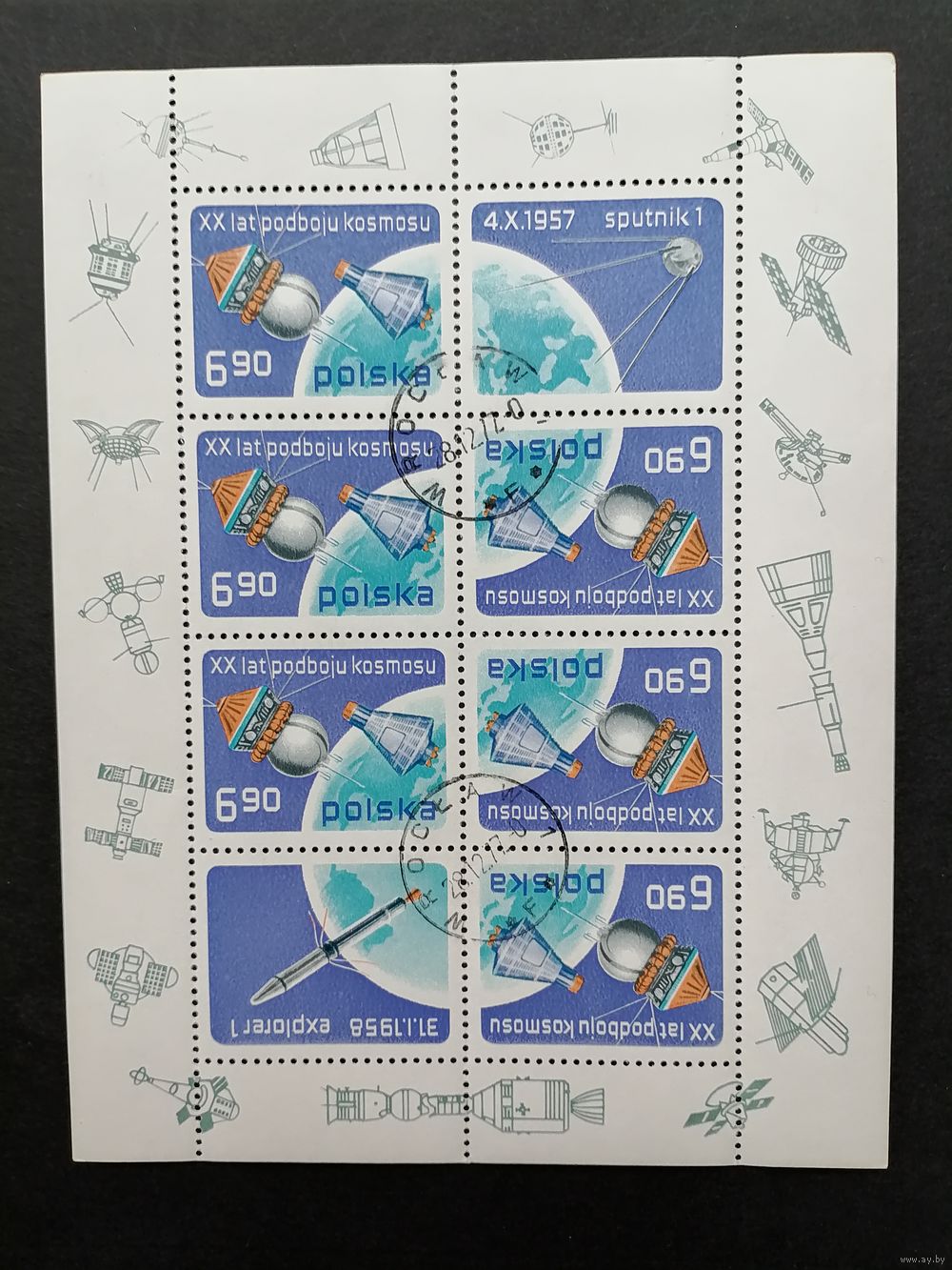 Польша 1977 Малый лист с 6 марками и 2 купонами "20 лет международного завоевания космоса" (гашение с клеем) Mi.2539 каталог 4.00 евро