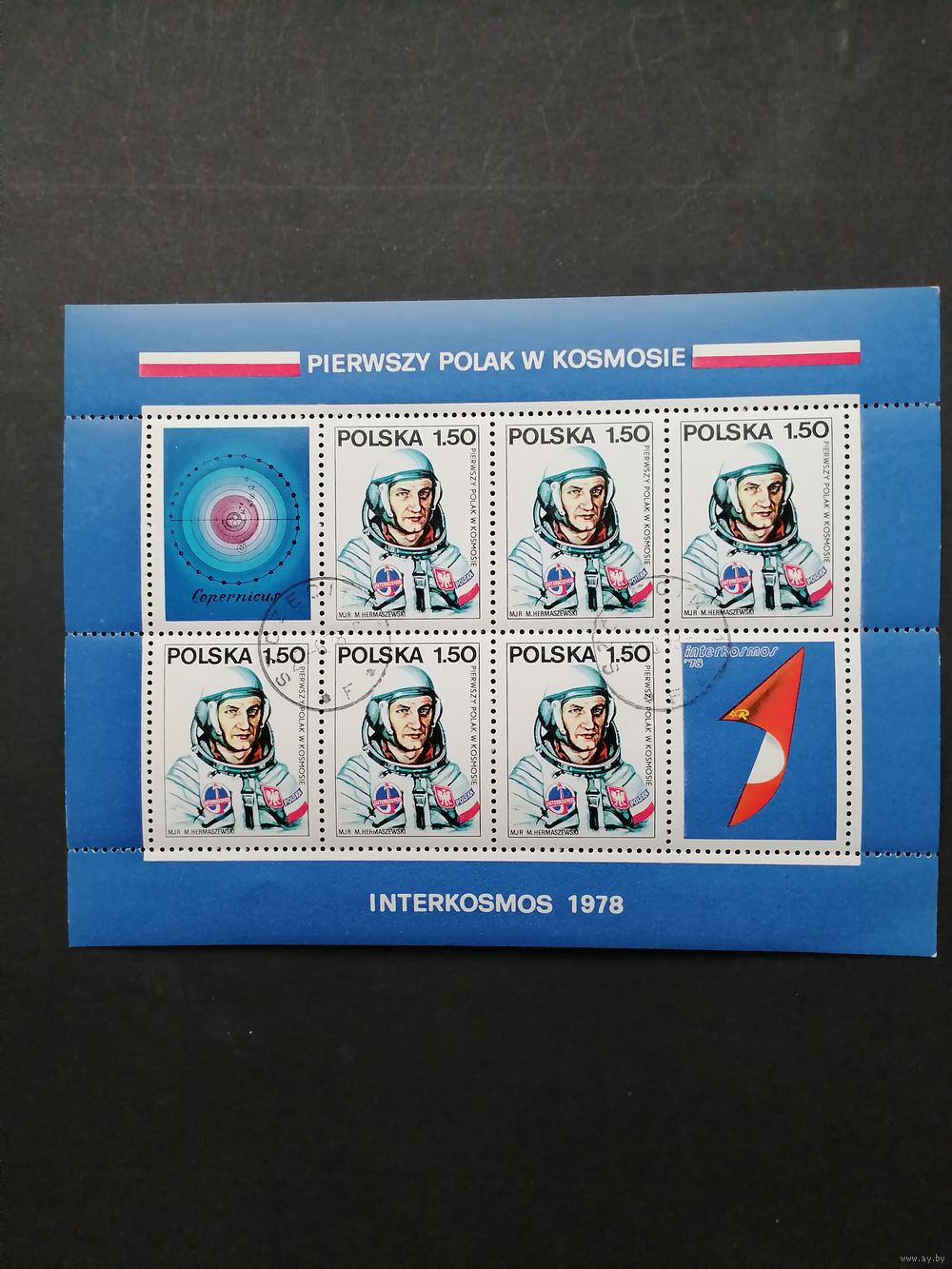 Польша 1978 Блок Mi.70 с 6 марками и 2 купонами "Программа "ИНТЕРКОСМОС": первый польский космонавт" (гашение с клеем) Mi.2563 каталог 3.60 евро