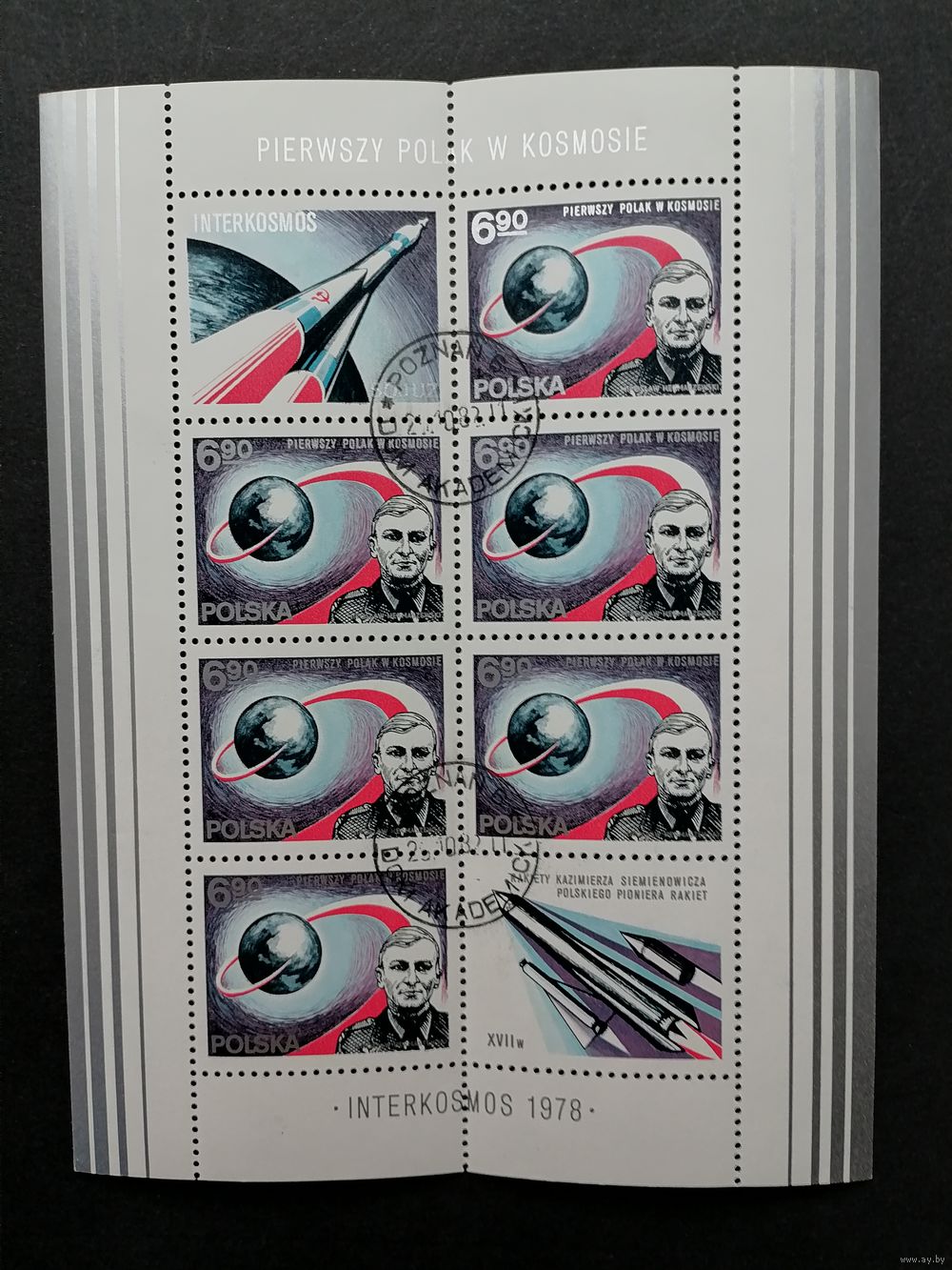 Польша 1978 Блок Mi.71 с 6 марками и 2 купонами "Программа "ИНТЕРКОСМОС": первый польский космонавт" (гашение с клеем) Mi.2564 каталог 5.00 евро