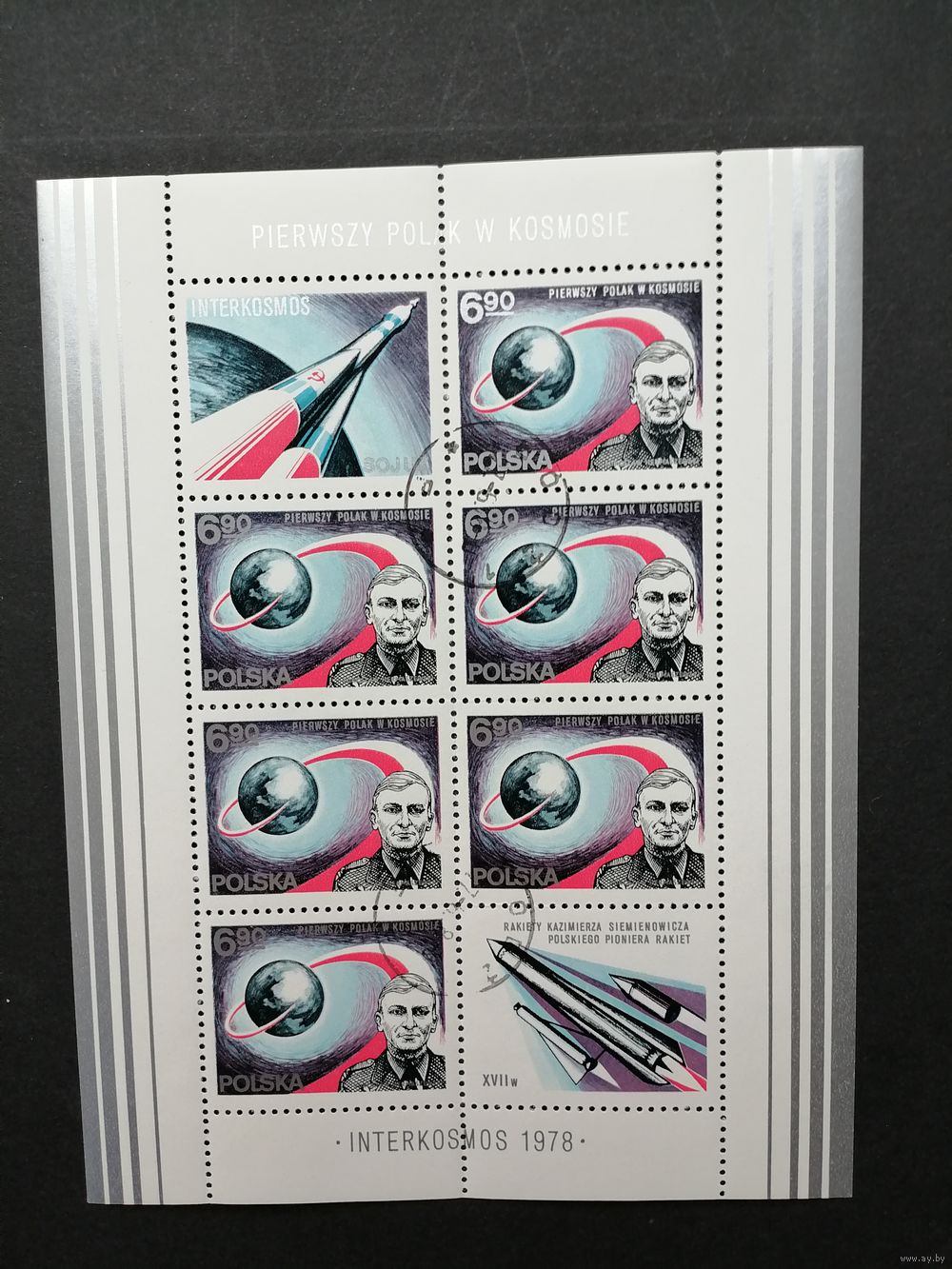 Польша 1978 Блок Mi.71 с 6 марками и 2 купонами "Программа "ИНТЕРКОСМОС": первый польский космонавт" (гашение с клеем) Mi.2564 каталог 5.00 евро