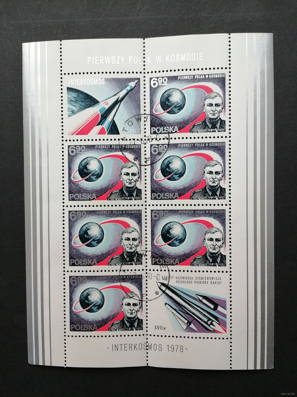 Польша 1978 Блок Mi.71 с 6 марками и 2 купонами "Программа "ИНТЕРКОСМОС": первый польский космонавт" (гашение с клеем) Mi.2564 каталог 5.00 евро