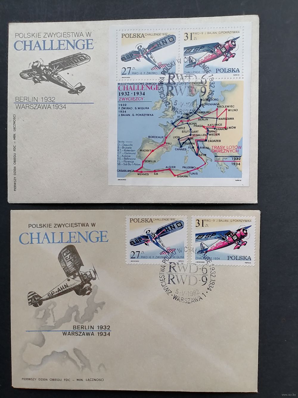 Польша 1982 Два КПД с блоком Mi.87 и серией марок "Участие в турне по Европе на туристическом самолете "Сhallenge"" (спецгашение) Mi.2806-2807 каталог 8.50 евро