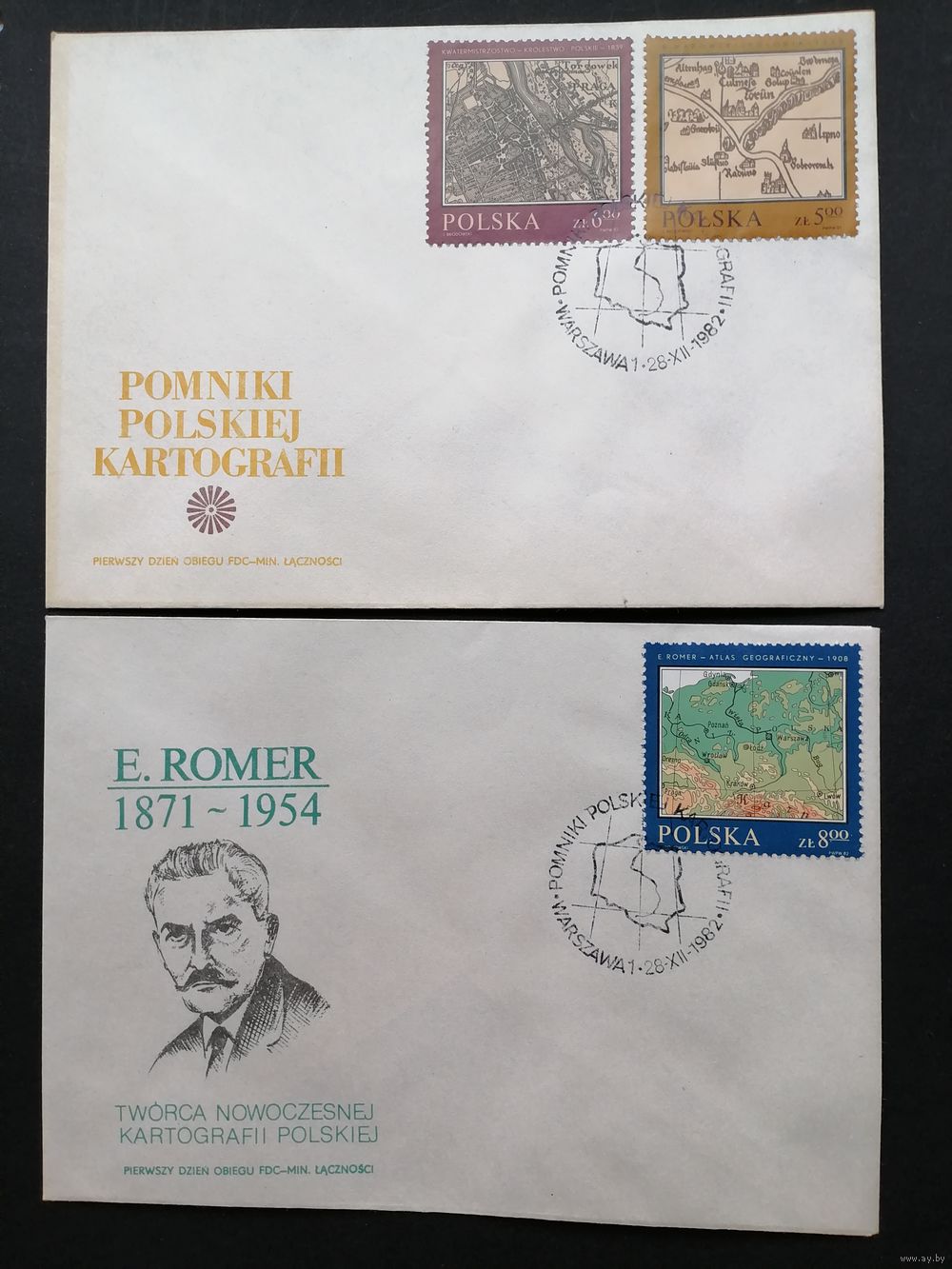 Польша 1982 Три КПД с полной серией марок "История картографии в Польше" (спецгашение) Mi.2844-2847 каталог 2.50 евро