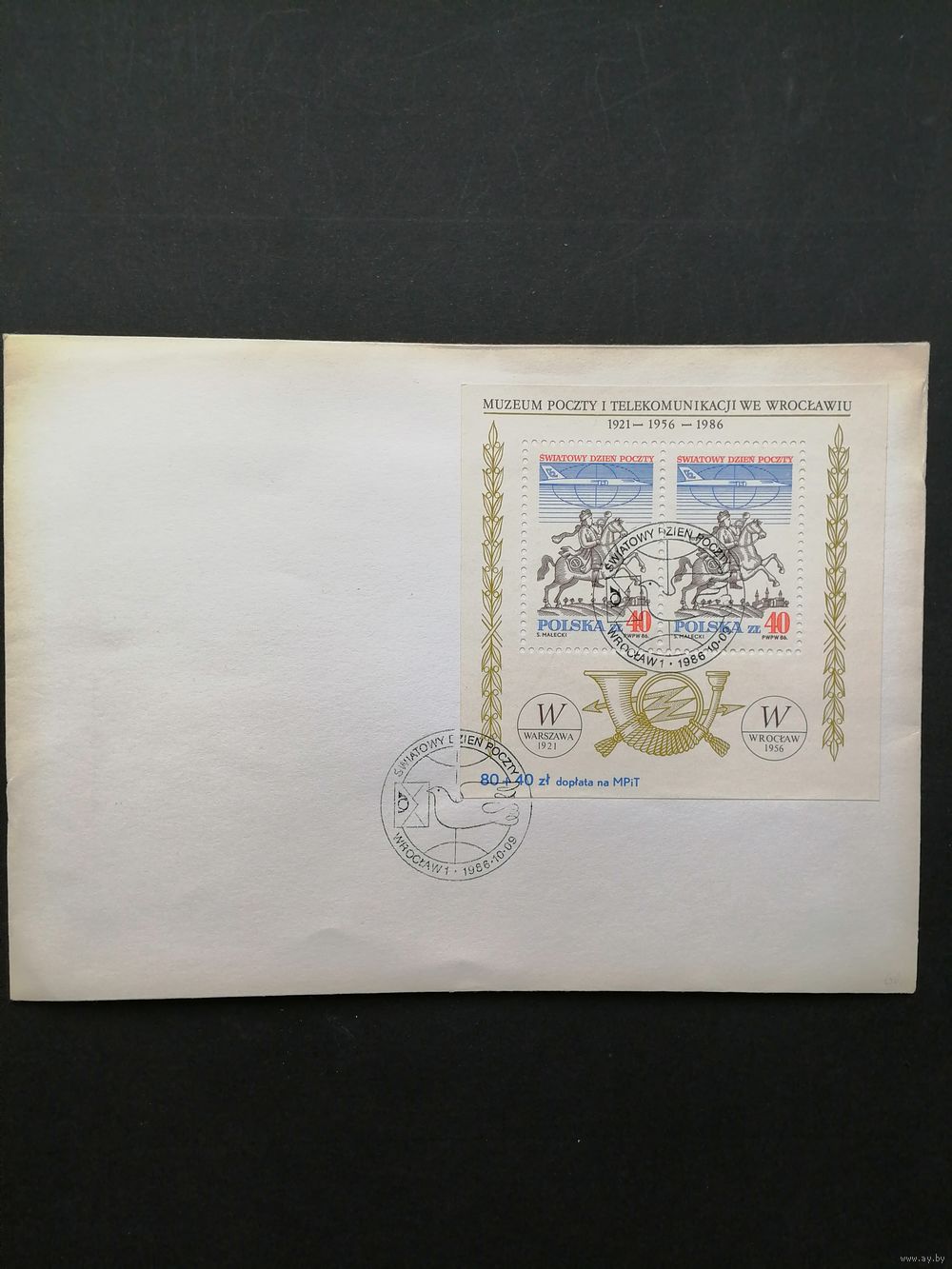 Польша 1986 Конверт с блоком Mi.101 посвященным Музею почты и телекоммуникаций во Вроцлаве (Breslau) с марками "Всемирный день почты" (спецгашение) Mi.3051х2 каталог 30.00 евро