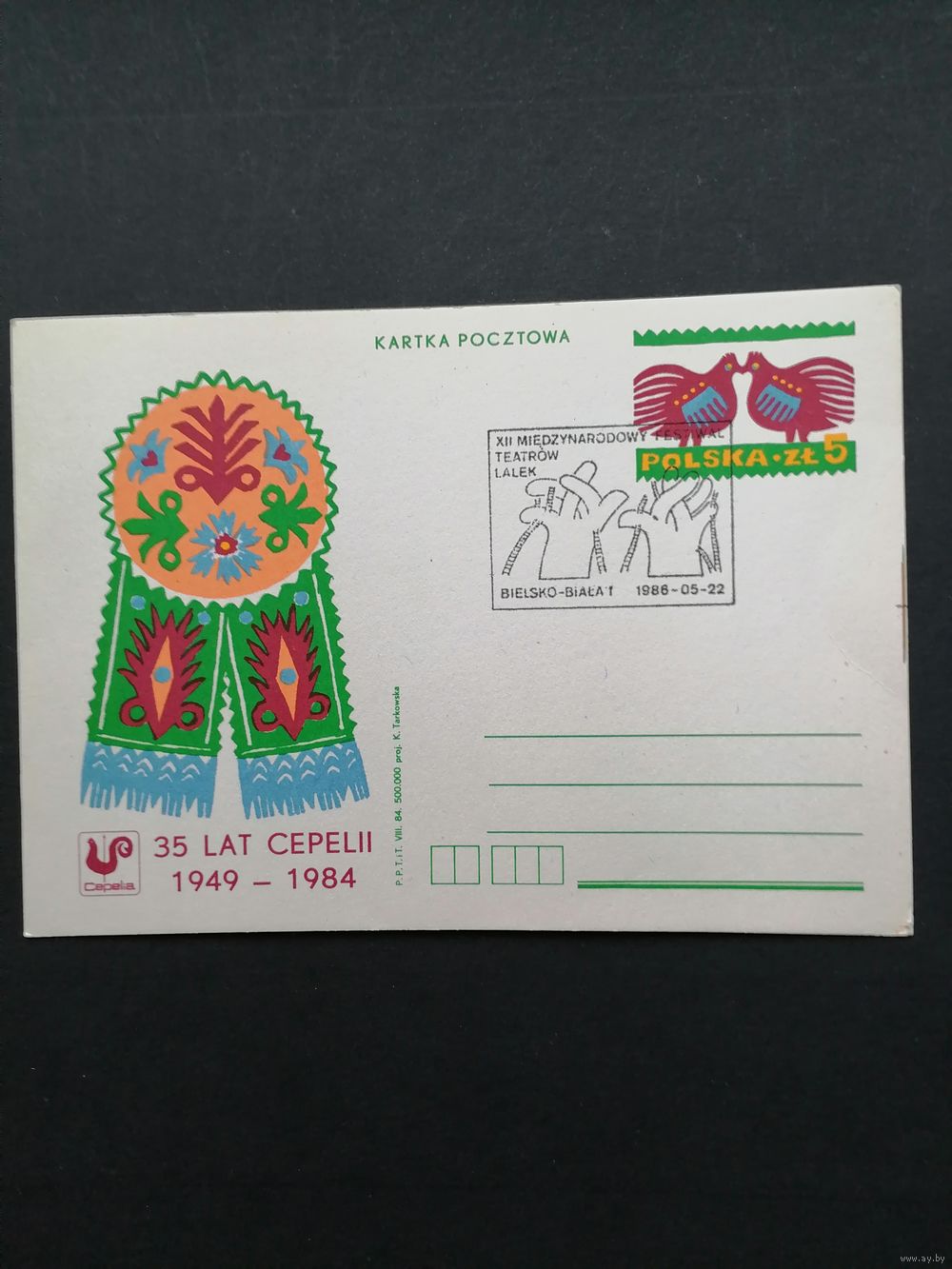 Польша 1986 Почтовая карточка посвященная "35 лет "CEPELII" с типографской маркой (спецгашение XII международный фестиваль театров кукол в Белско-Бяла)