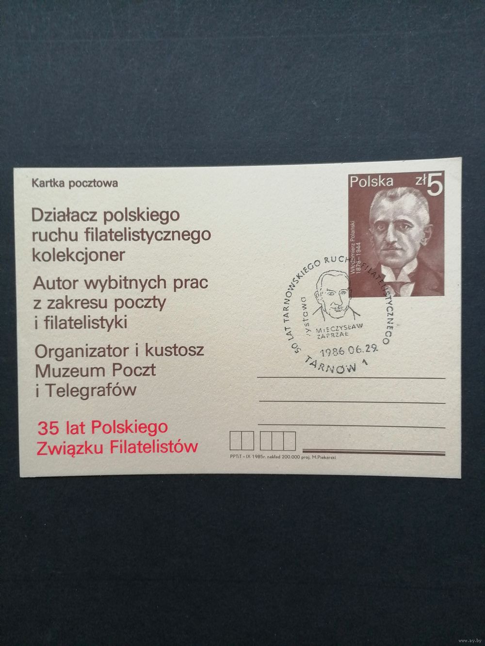 Польша 1986 Почтовая карточка с типографской маркой "35 лет союзу филателистов Польши " (спецгашение 50 лет союзу филателистов в Торуни)