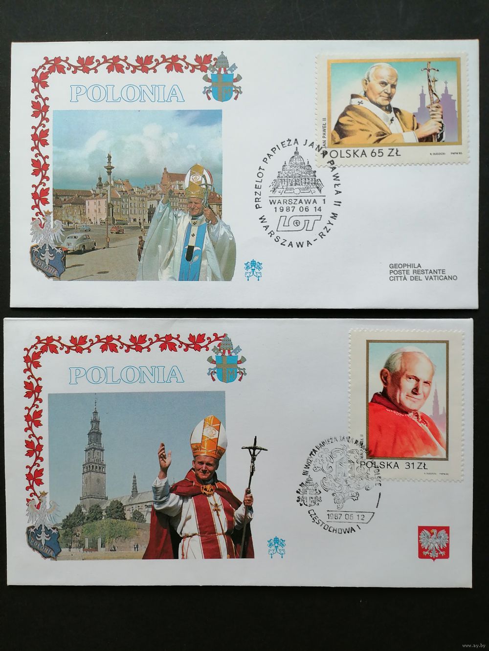 Польша 1987 Два конверта "POLONIA" с полной серией марок 1983 года "II визит Папы Павла II в Польшу" (разные спецгашения 1987 года) Mi.2868-2869 каталог 2.50
