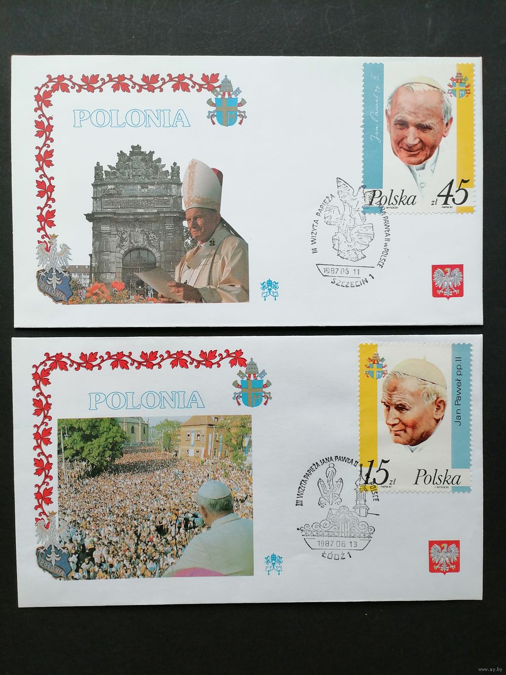Польша 1987 Два конверта "POLONIA" с полной серией марок 1987 года "III визит Папы Павла II в Польшу" (разные спецгашения 1987 года) Mi.3099-3100 каталог 2.50 евро