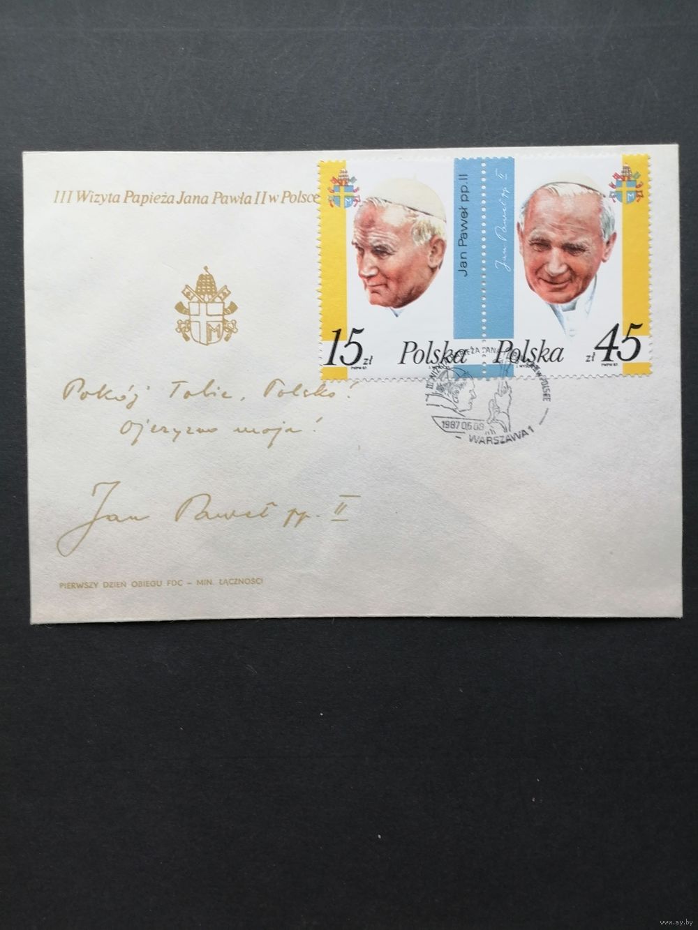 Польша 1987 КПД с полной серией марок в сцепке "III визит Папы Римского Иоанна Павла II в Польшу" (спецгашение) Mi.3099-3100 каталог 1.50 евро
