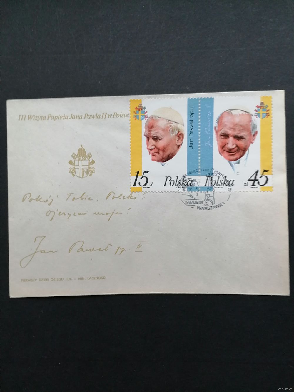Польша 1987 КПД с полной серией марок в сцепке "III визит Папы Римского Иоанна Павла II в Польшу" (спецгашение) Mi.3099-3100 каталог 1.50 евро