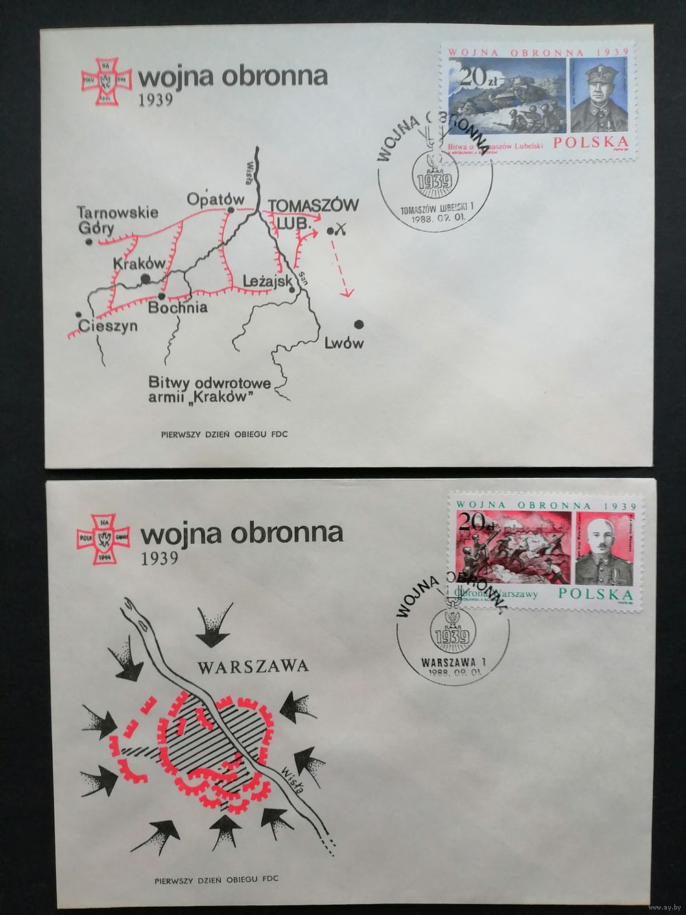 Польша 1988 Три КПД с полной серией марок "49-ая годовщина начала Второй мировой войны (оборонной войны Польши): оборонные сражения" (спецгашение) Mi.3159-3161 каталог 1.00 евро