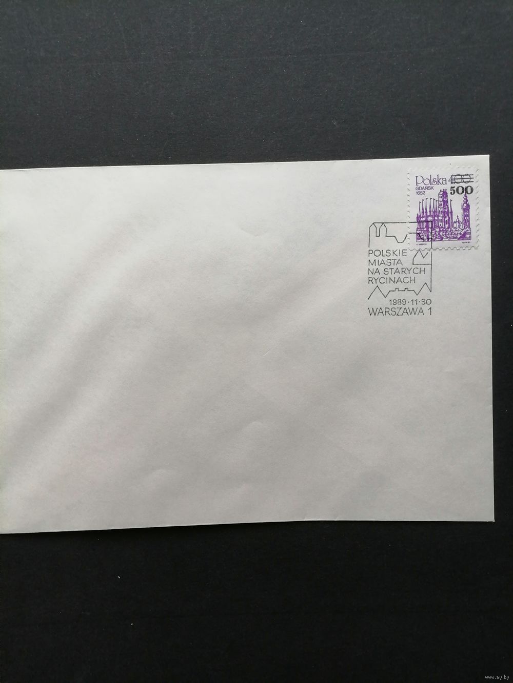 Польша 1989 Конверт с маркой Mi.2752 с надпечаткой нового номинала "500 zl" "Виды города" (спецгашение "Польские города на старых рисунках") Mi.3234 каталог 1.70 евро