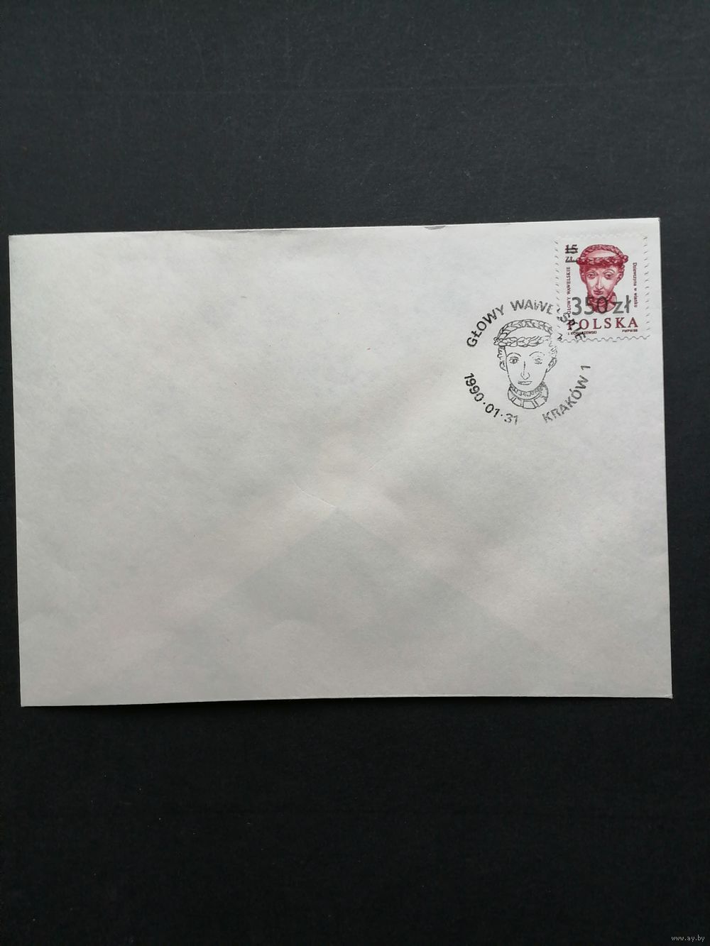 Польша 1990 Конверт с маркой Mi.3168 и надпечаткой на ней нового номинала 350 Zl "Голова в Вавельском замке Кракова" (спецгашение) Mi.3253 каталог 1.50 евро