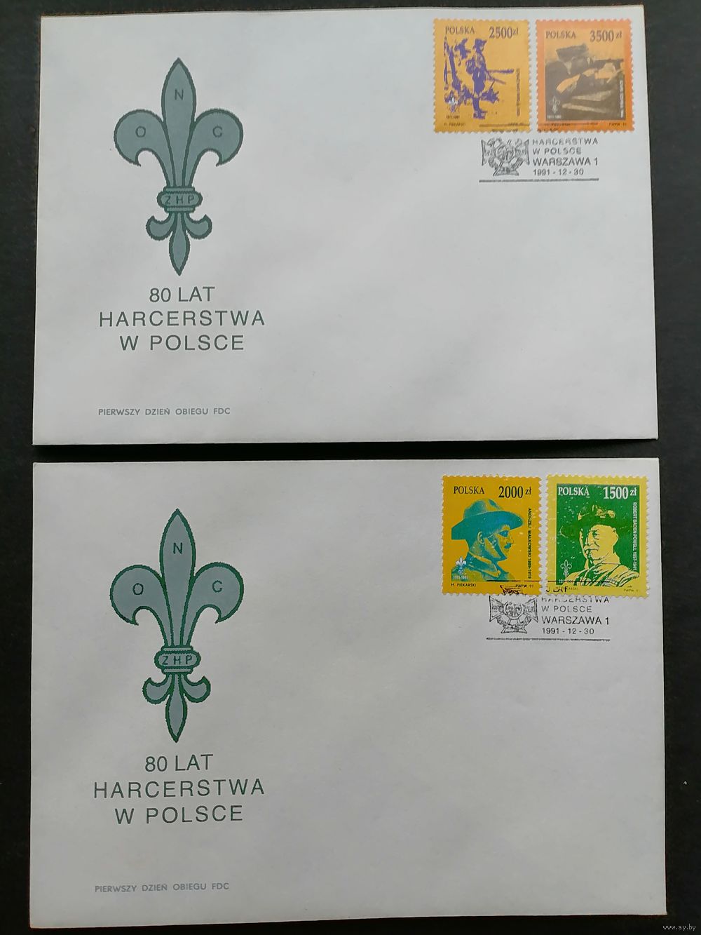Польша 1991 Два КПД с полной серией марок "80 лет движению бойскаутов в Польше" (спецгашение) Mi.3357-3360 каталог 3.00 евро
