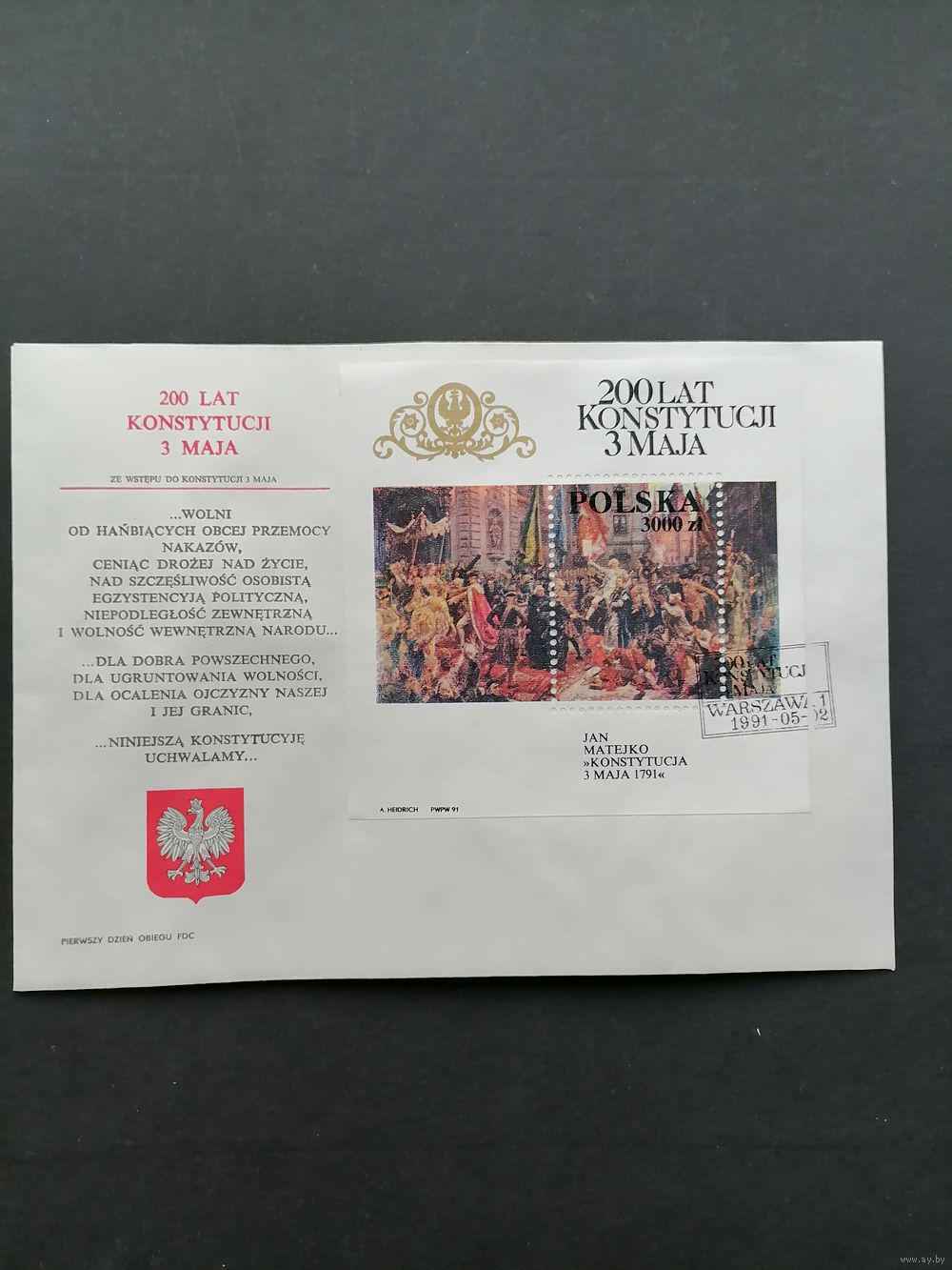Польша 1991 КПД с блоком Mi.112 и маркой "200 лет Конституции 3-ого Мая" (спецгашение) Mi.3330 каталог 1.50 евро