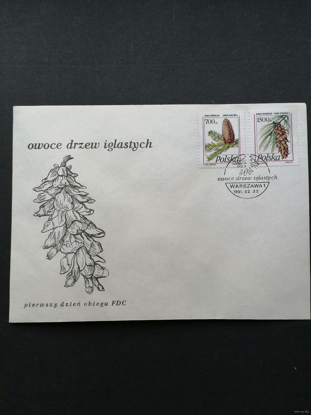 Польша 1991 КПД с полной серией марок "Шишки хвойных деревьев" (спецгашение) Mi.3312-3313 каталог 0.70 евро