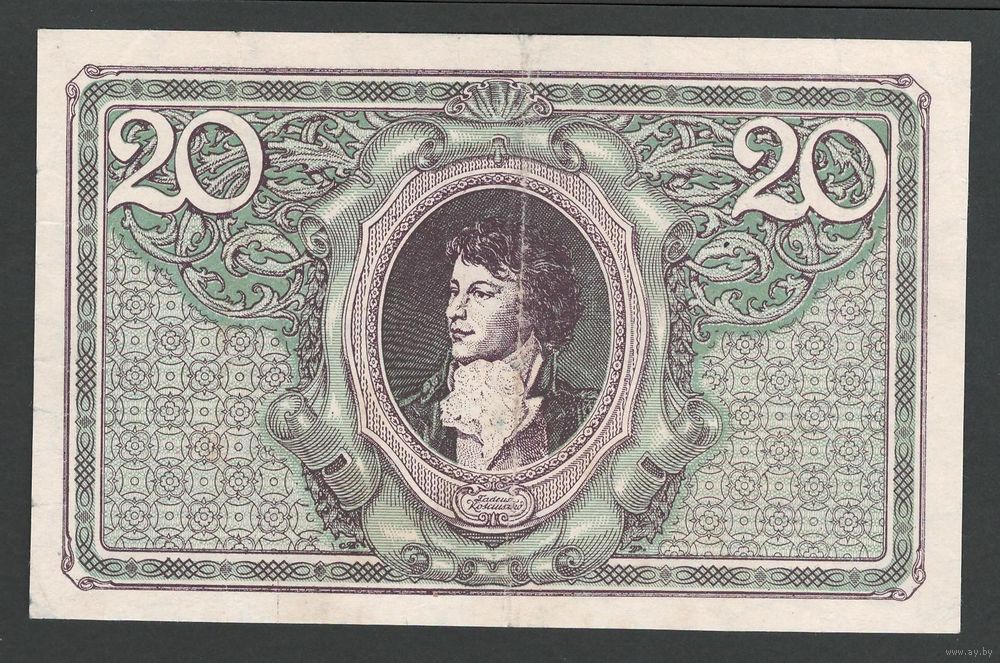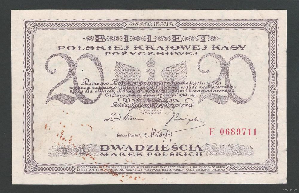 Польша 20 марок 1919 года. Тип P-21(3). Состояние XF-