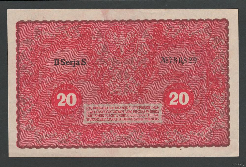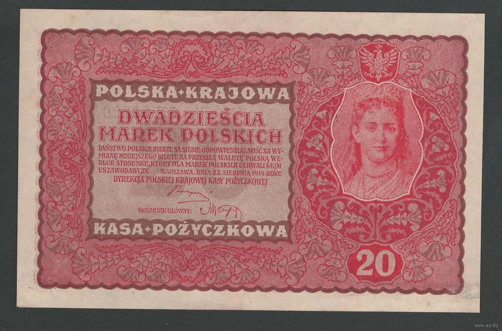 Польша 20 марок 1919 года. Тип P-26(2). Состояние aUNC