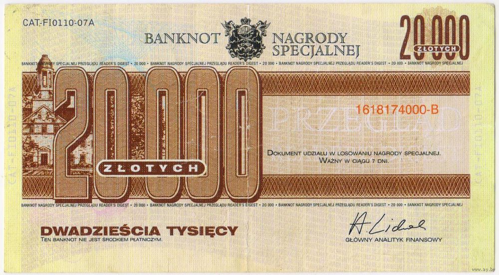 Польша. Банкнота 20000 злотых. Banknot nagrody specjalnej