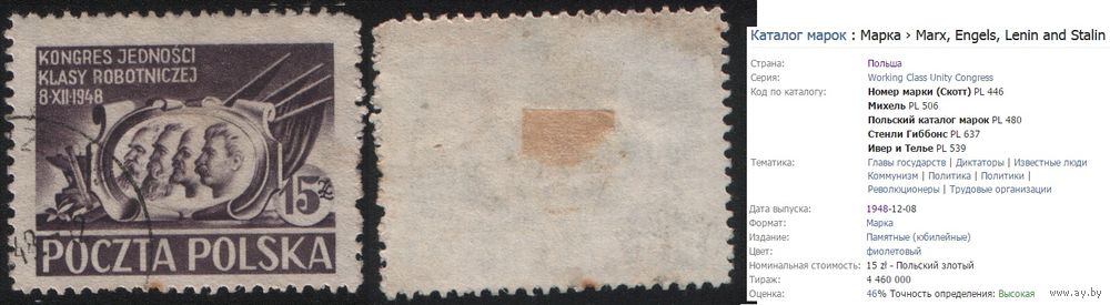 Польша (Mi)PL506 юбилейная марка 15 злотых 1948 год сер.(Конгресс единства рабочего класса) - Маркс, Энгельс, Ленин и Сталин (CTO) (a1-01 ТОРГ/ВАША ЦЕНА