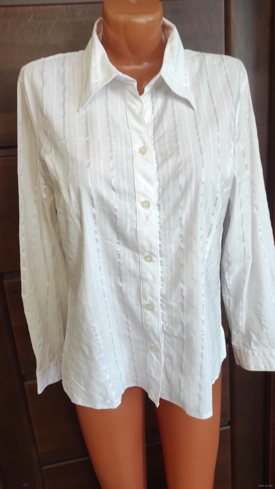 Польская светлая рубашка на 50-52 размер, в вертикальную полоску. Отлично сидит на фигуре. хорошее состояние, б/у, носила мало. Замеры: Длина 63,5 см, длина рукава 61 см, ПОгруди 54 см, ПОталии 49 см. 62% хлопка, 35% полиэстера, 3% эластана.