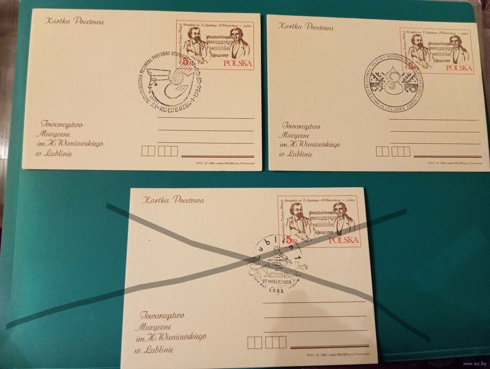 Левая карточка: Прошла процедуру специального гашения (СГ) штемпелем «22 Festiwal Piosenki Radzieckiej» (22-й Фестиваль советской песни) в Зелёна-Гуре, датированным 14 июня 1986 года.