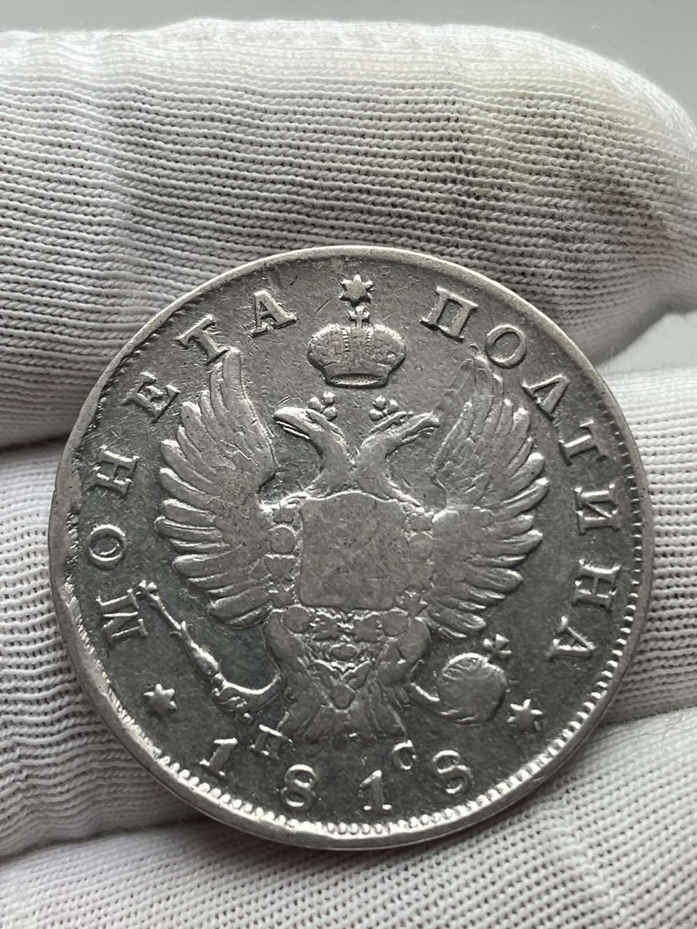 Аверс: в середине двуглавый орел с поднятыми крыльями, увенчанный тремя коронами, на груди орла герб Москвы, окруженный цепью Ордена Святого Андрея Первозванного, в левой лапе скипетр, в правой держава, слева и справа под хвостом инициалы минцмейстера «ПС» (Павел Ступицын), ниже год выпуска «1818», слева и справа от него шестиконечные звездочки. Слева сверху над орлом надпись по краю «МОНЕТА», в центе сверху шестиконечная звезда, справа вдоль края обозначение достоинства «ПОЛТИНА», по краю монеты ободок из точек.