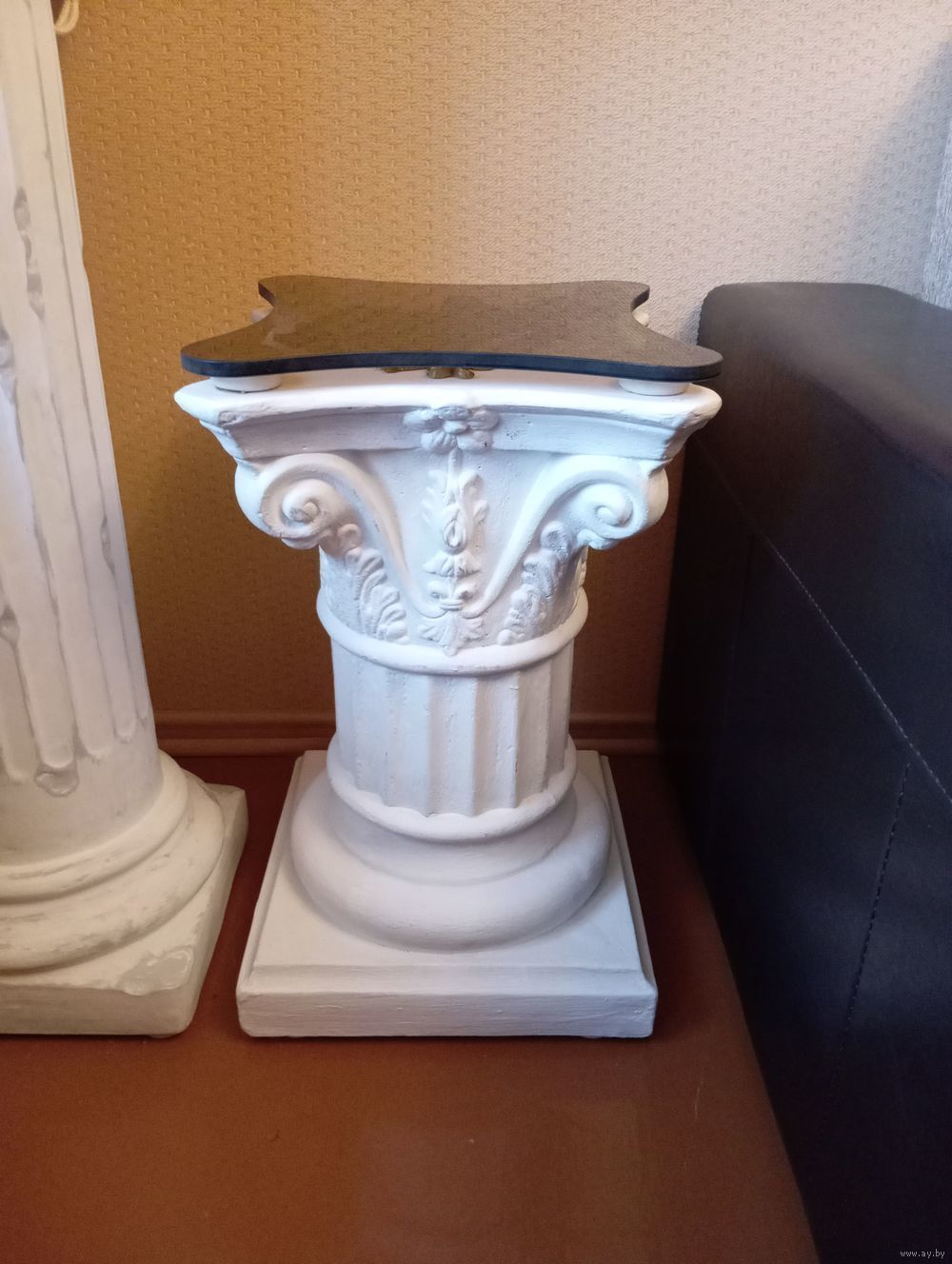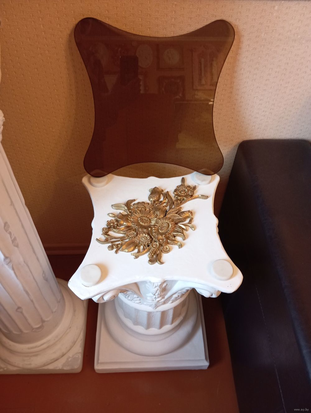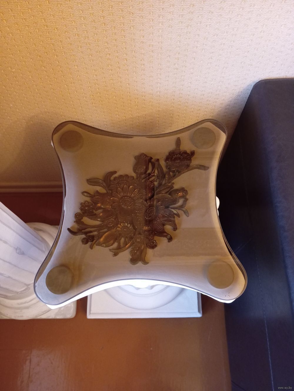 Полу-Пьедестал Бетон 56х34 см Стекло тонированное Толщина 8 мм , резиновые подставки под стекло 4 шт и такие же под Пьедесталом 4 шт , под стеклом барельеф цветы пластик с бронзовым покрытием закрывающие по всей высоте пьедестала отверстие Д 10 см , вазон с блюдом под ним и искусственными цветами + 1 шт. запасное стекло (фото) . САМОВЫВОЗ