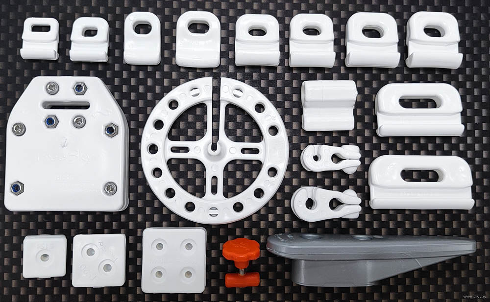 Набор из 2 уток, 2 защитные площадки + 2 как нижняя закладная, наклейка шаблон для установки, 4 винта М6х60, шайбы усиленные, гайки самоконтрящиеся. Весь крепеж - морская нержавейка AISI316 / A4. Чертежи с размерами среди фото. Цвет серебристый.
