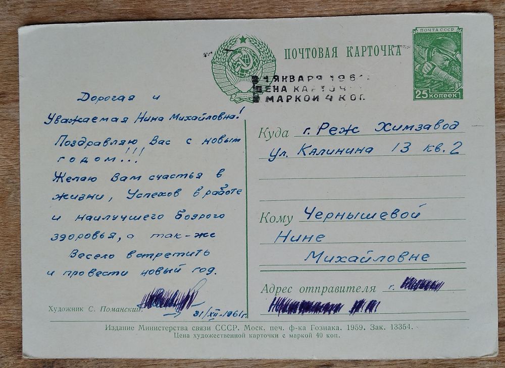 Поманский С. С Новым Годом! 1959 г. ПК. Прошла почту.